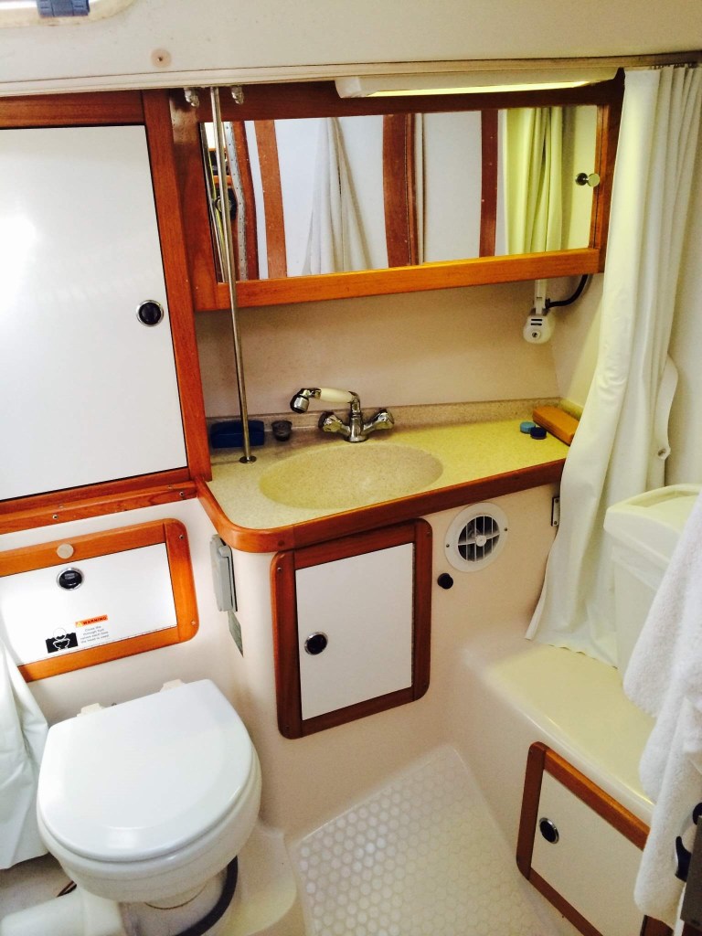 The bathroom (known as a head on a boat) is always spotless and features an electric toilet – no manual pumping like many charter boats out there.